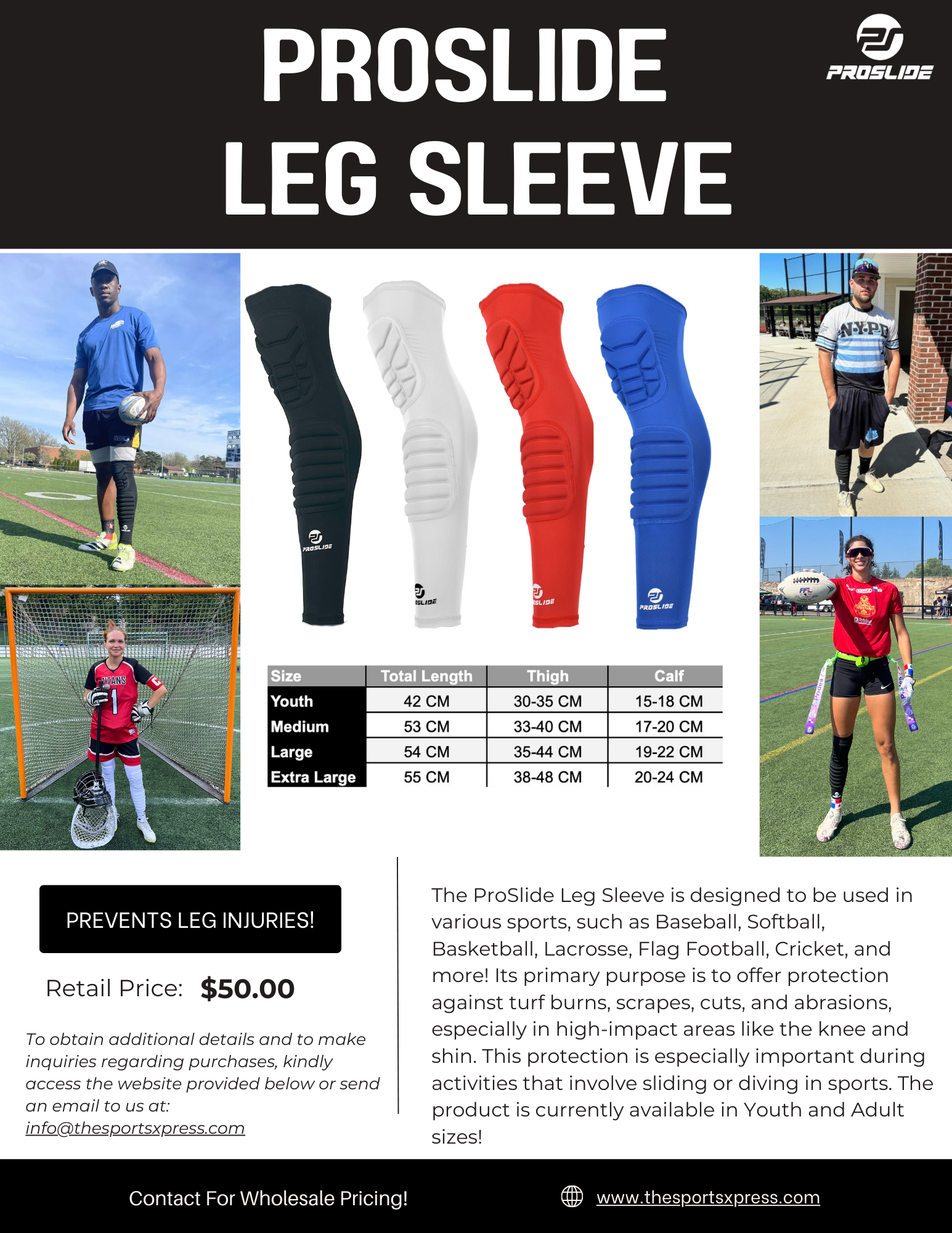 The ProSlide Leg Sleeve is designed to be used in various sports such as baseball, softball, basketball, lacrosse, flag football, cricket, rugby and more. It offers protection against turf burn, scrapes, cuts and abrasions.